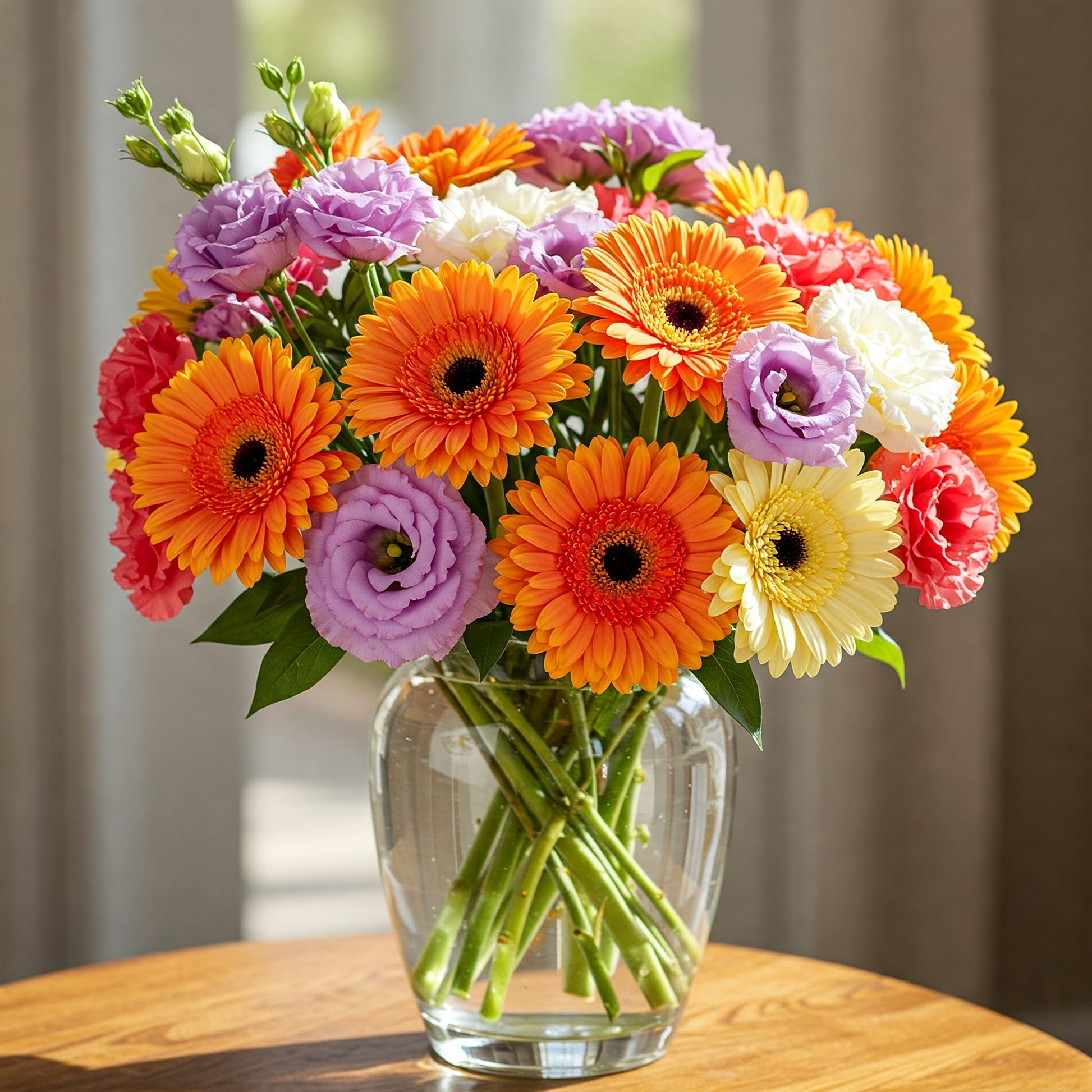 This charming and sweet arrangement sings southern bell! With its blend of gerbera daisies, lisianthus, and carnations, it's perfect for any occasion!