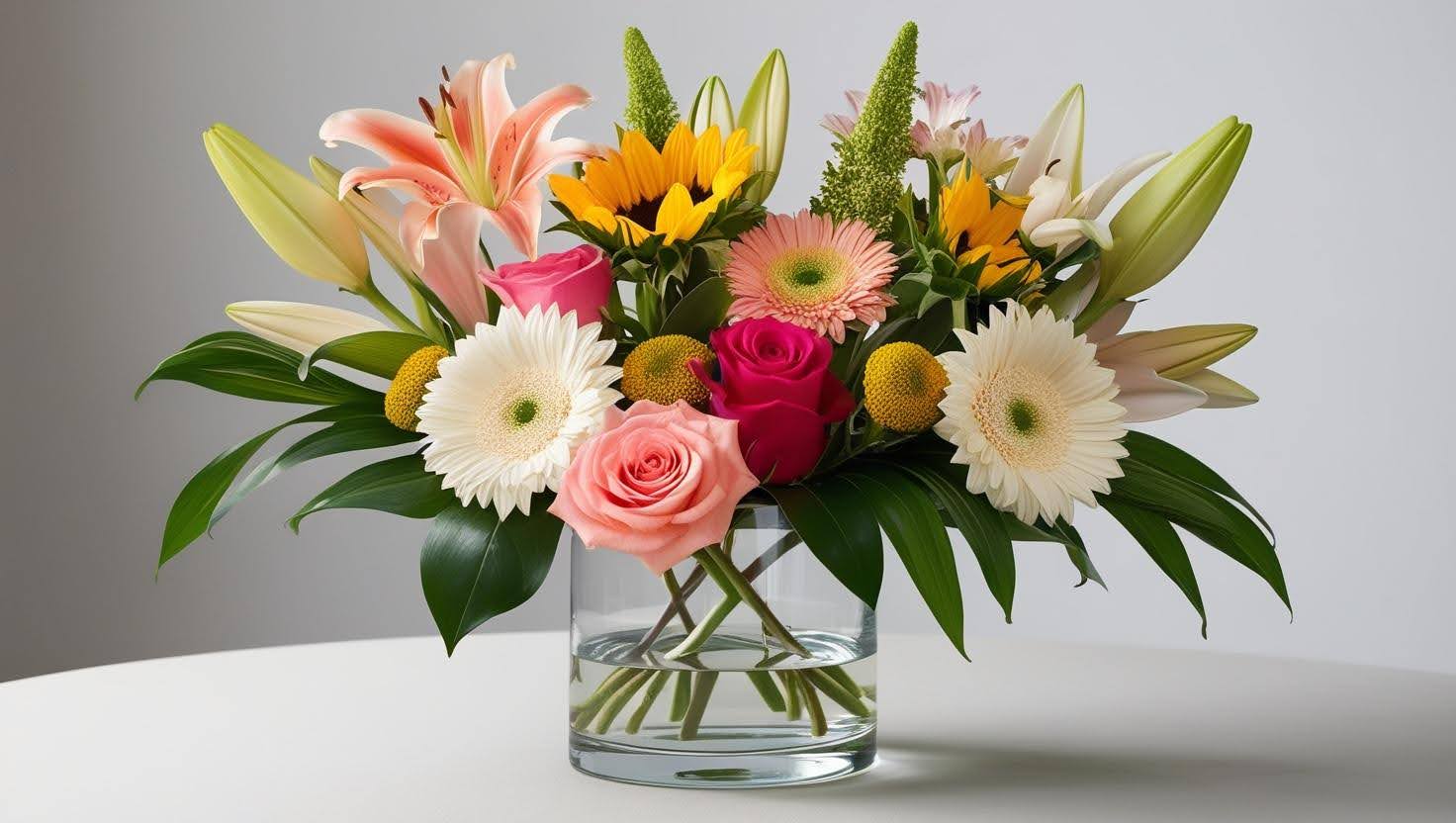 A vibrant harmony of sunny sunflowers, romantic roses, cheerful gerberas and elegant lilies.