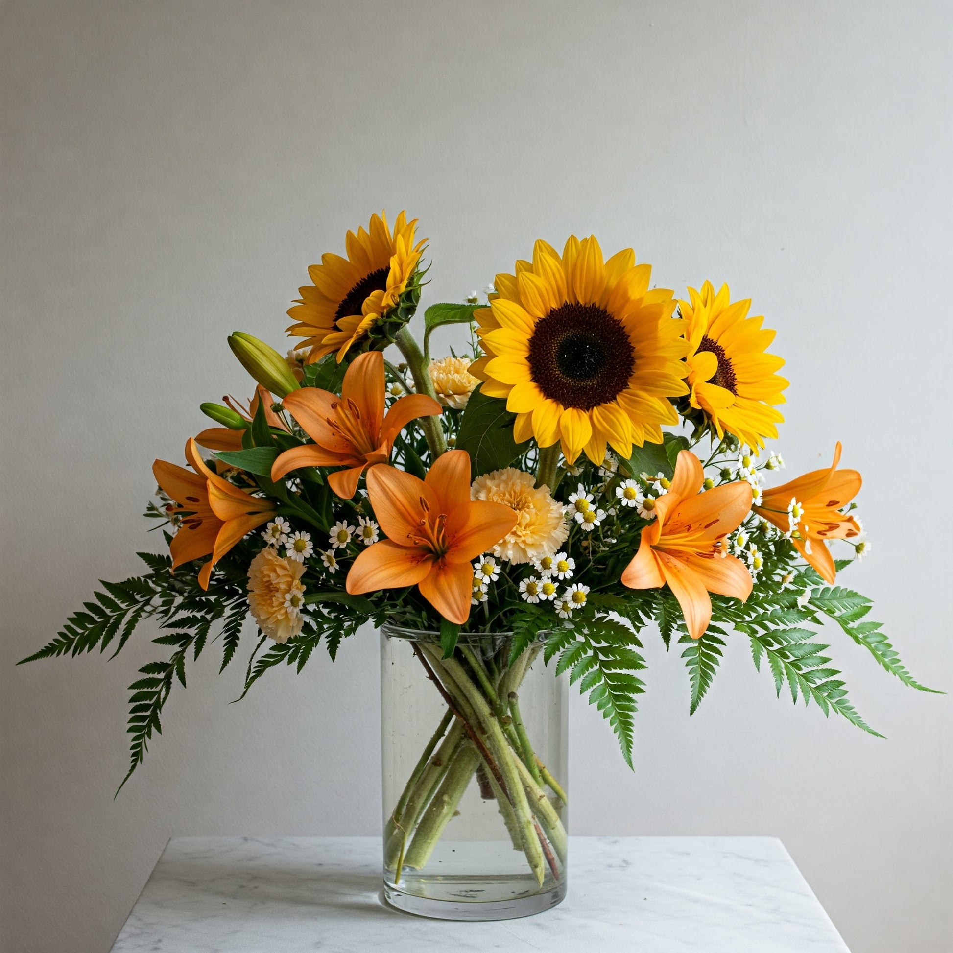 This arrangement is bursting with sunflowers and lilies to brighten someone's day!