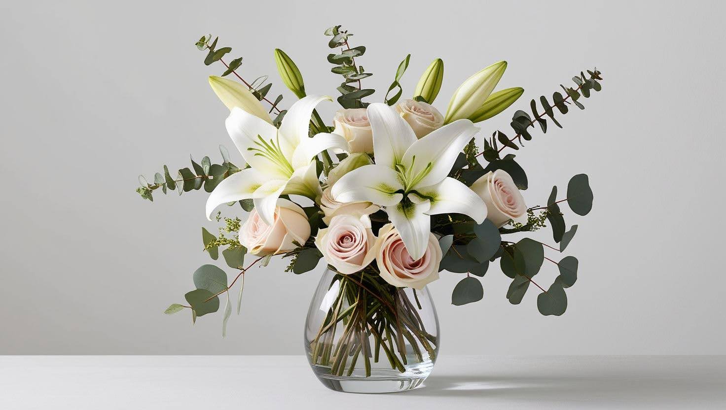 An arrangement where lilies and roses express sincere emotion through their delicate beauty.