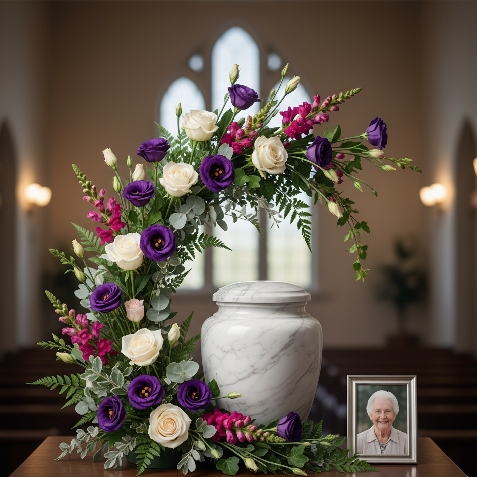 This elegant crescent of dignified purple and white flowers gently embraces the urn. Named "Heart's Comfort," this tribute provides a powerful visual symbol of peace and enduring love.