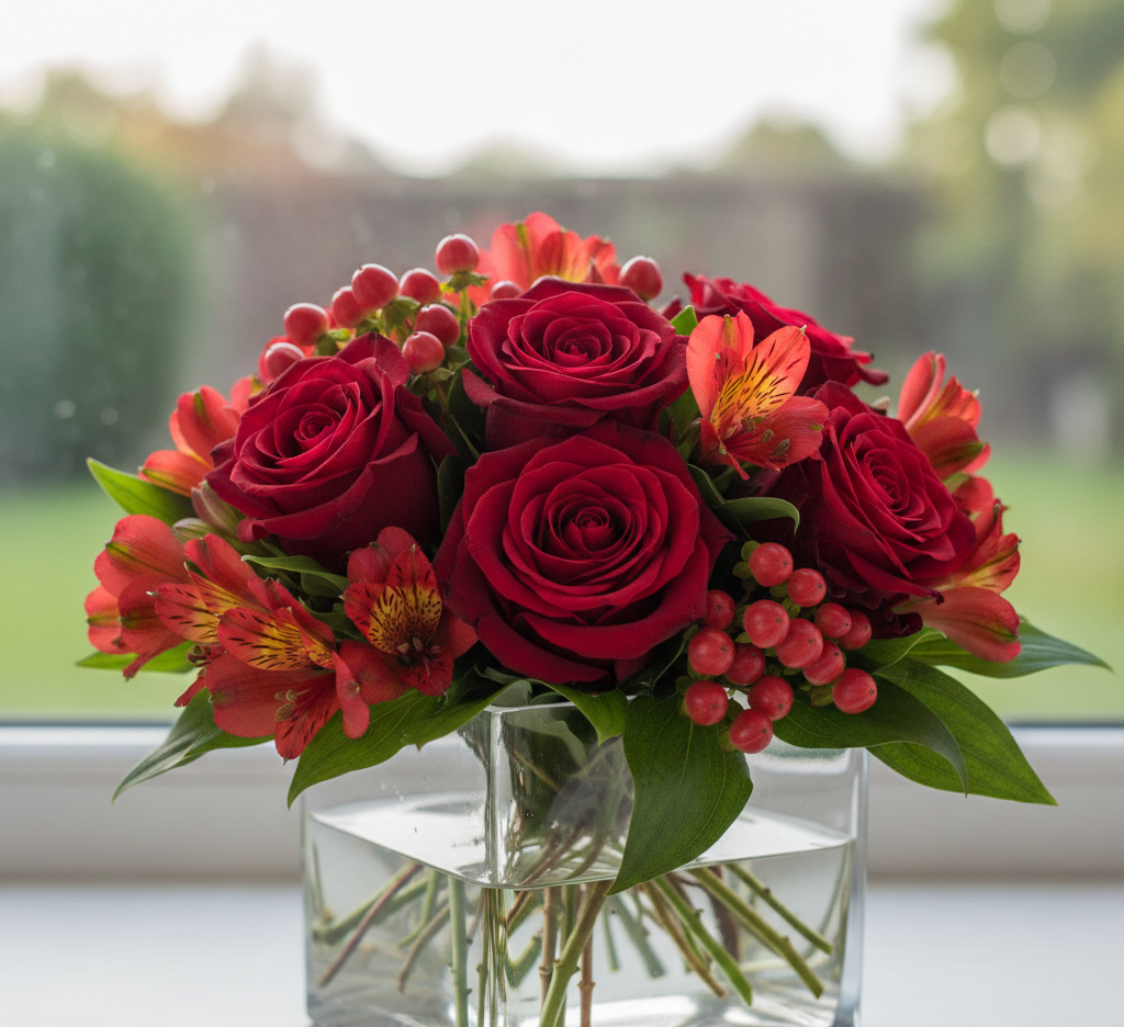 Classic red roses and long lasting alstroemeria. Pure elegance in every petal!