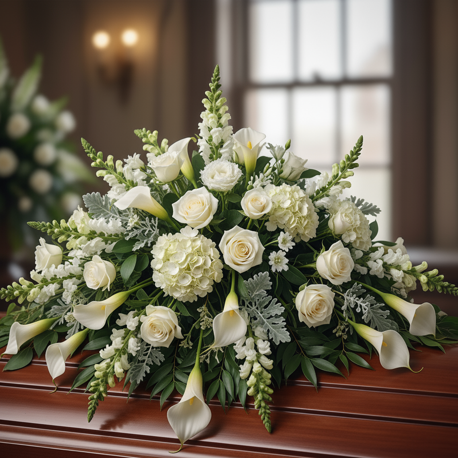 This all white casket spray embodies dignity and peace. Elegant calla lilies sweep across the arrangement, symbolizing purity, while white roses and hydrangeas create a full, heartfelt tribute. The soft grey-green foliage provides a gentle backdrop, celebrating a timeless backdrop and offering deep comfort.