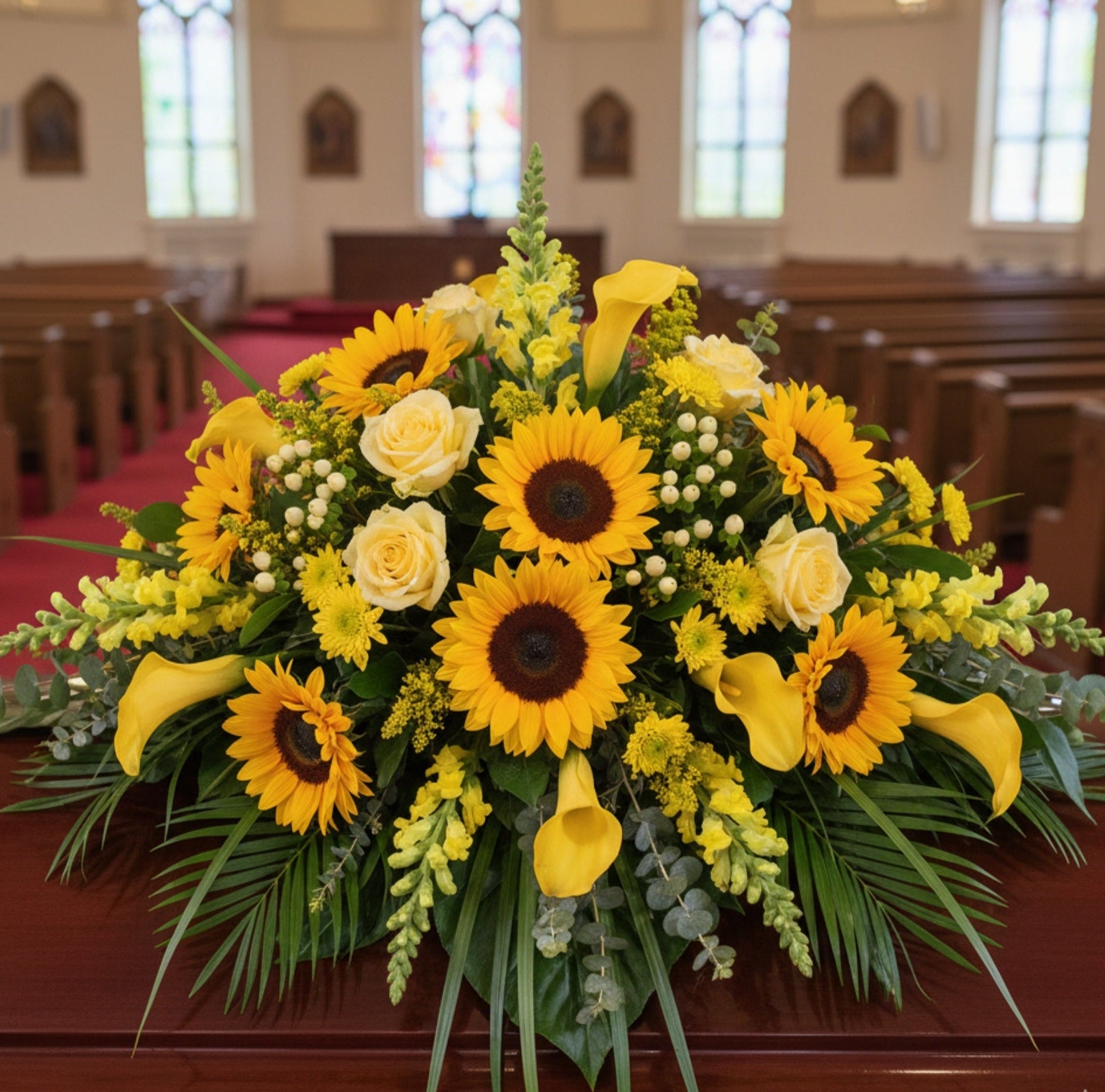 This vibrant casket spray of sunflowers and yellow roses is a powerful symbol of lasting joy and happy memories that will never fade.