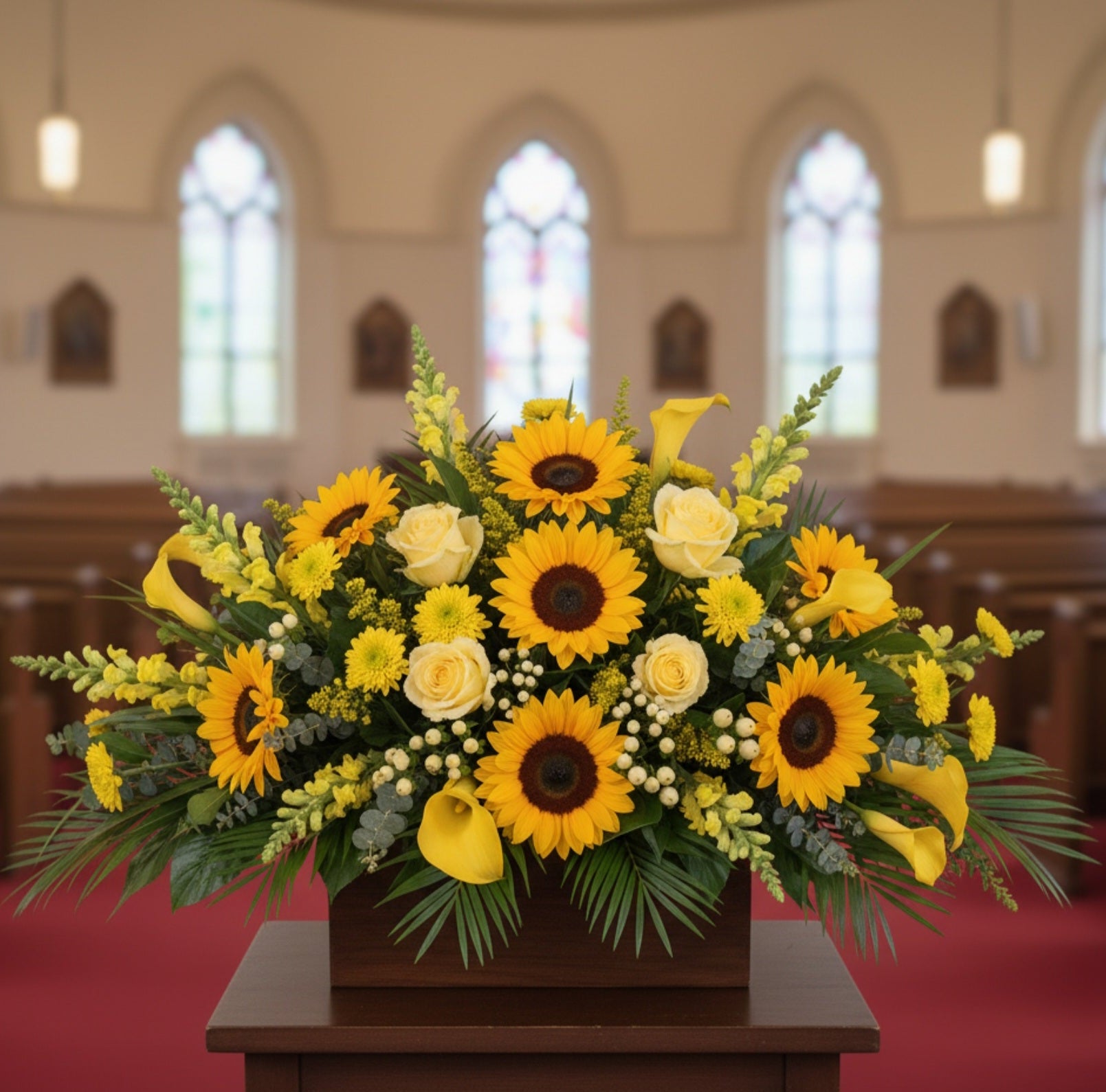 This vibrant and uplifting centerpiece features a radiant display of sunflowers, yellow roses and calla lilies. Designed to convey warmth, adoration and lasting happiness, this arrangement is a beautiful focal point celebrating a life full of light.
